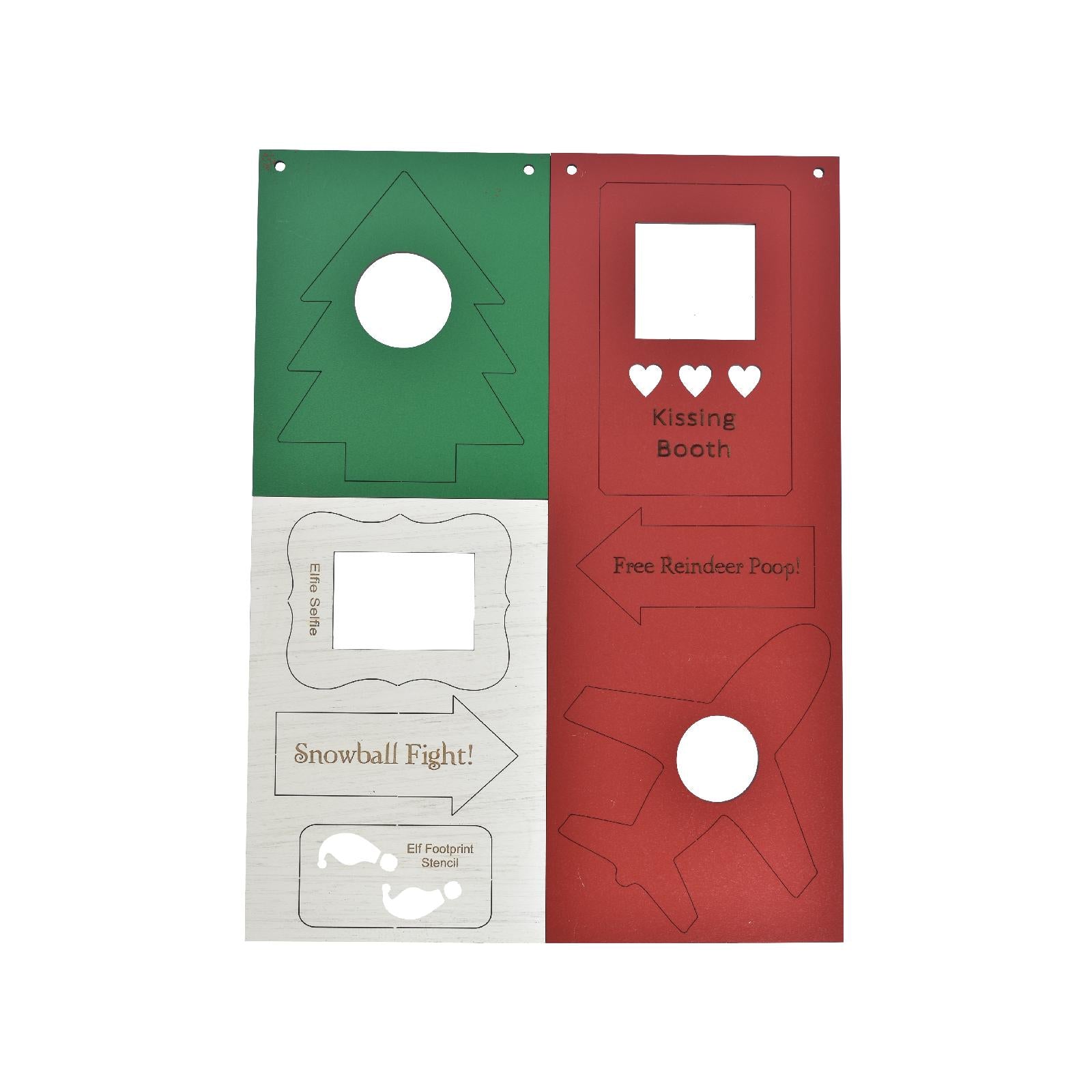 This pop-out wooden boards contains 7 elf-sized props: a Christmas tree, an elfie selfie frame, a snowball fight arrow sign, an elf footprint stencil, a kissing booth, a free reindeer poop sign, & an airplane.